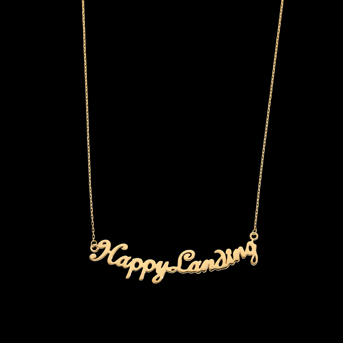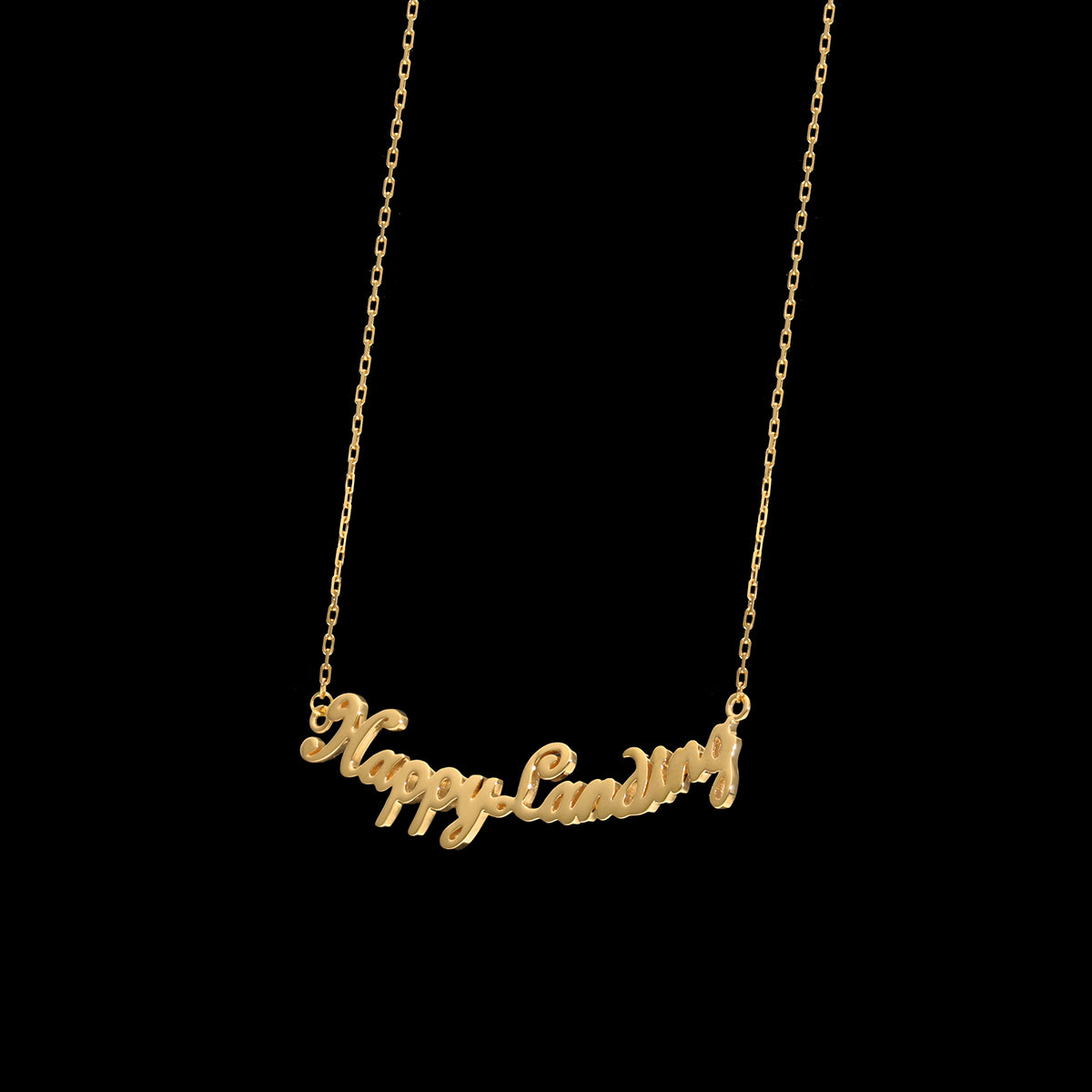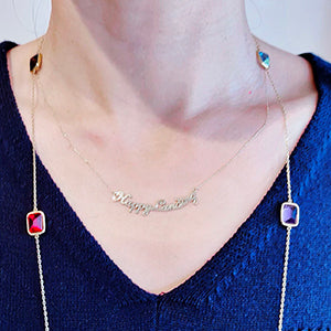 大ぶりなネックレスとの重ね付けにも相性抜群。さりげないおしゃれが胸元にのぞく、メッセージチェーン。